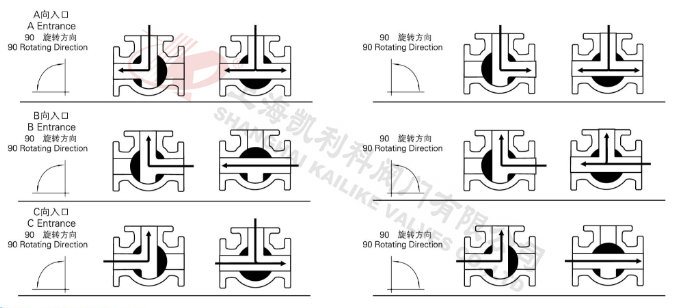 電動低溫三通球閥分L型和T型,介質(zhì)流通方向見下圖。L型電動三通球閥適用于介質(zhì)流向的切換,能使相互垂直的兩個通道連通:T型電動三通球閥適用于介質(zhì)的分流、合流或流向 切換,T型孔道可以使三個通道互相連通或使其中兩個通道連通,電動三通球閥一般采用三個閥座結(jié)構(gòu),亦可根據(jù)用戶要求采用四閥座結(jié)構(gòu)。