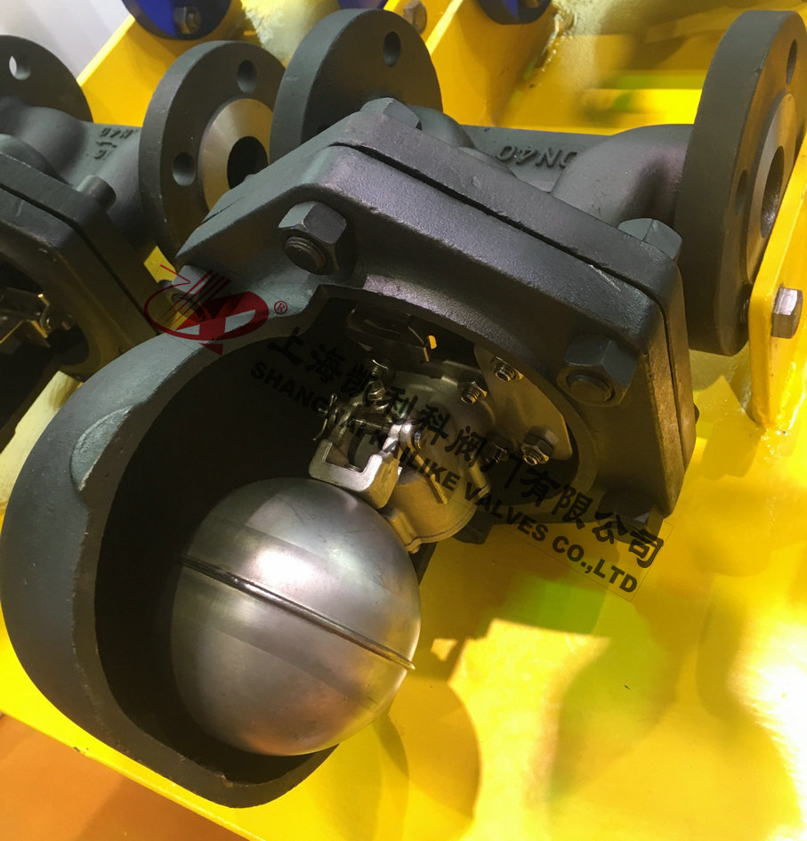 該閥剛啟動時,自動排空氣裝置迅速排除系統(tǒng)中不凝結(jié)氣體,當(dāng)蒸汽和熱凝結(jié)水進入后,閥腔內(nèi)溫度隨著升高,排空氣裝置自動關(guān)閉,浮球根據(jù)凝結(jié)水水位的變化而作升降,帶動杠桿調(diào)節(jié)閥座孔的開度,連續(xù)排放凝結(jié)水。當(dāng)凝結(jié)水停止進入時,浮球靠自重下降,驅(qū)使杠桿帶動閥芯關(guān)閉排水閥座孔。
