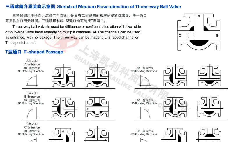 氣動(dòng)三通球閥分L型和T型,介質(zhì)流通方向見下圖。L型氣動(dòng)三通球閥適用于介質(zhì)流向的切換,能使相互垂直的兩個(gè)通道連通:T型氣動(dòng)三通球閥適用于介質(zhì)的分流、合流或流向 切換,T型孔道可以使三個(gè)通道互相連通或使其中兩個(gè)通道連通,氣動(dòng)三通球閥一般采用三個(gè)閥座結(jié)構(gòu),亦可根據(jù)用戶要求采用四閥座結(jié)構(gòu)。