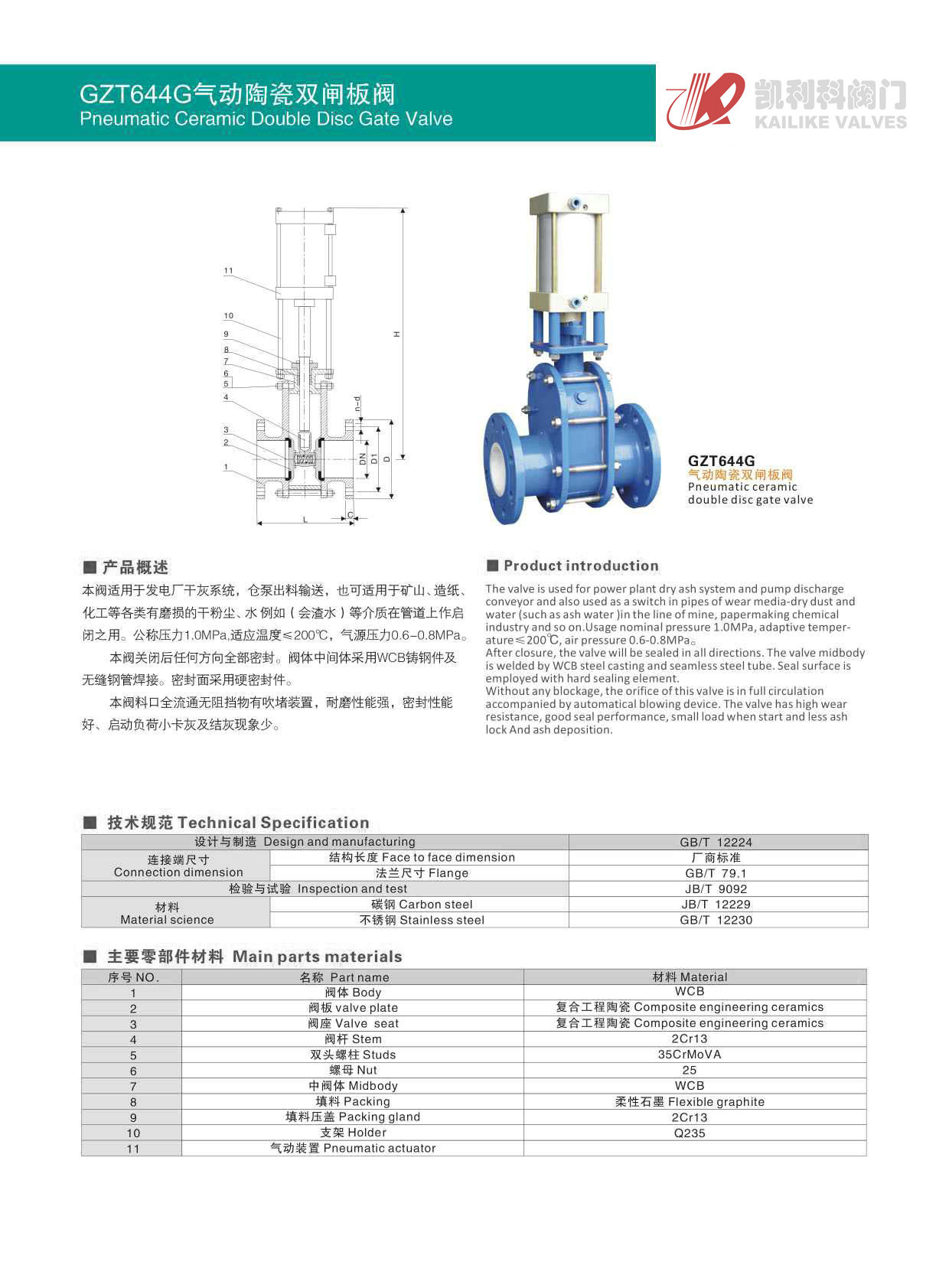 氣動陶瓷雙閘板閥關(guān)閉后任何方向全部密封。閥體中間體采用WCB鑄鋼件及無縫鋼管焊接。密封面采用硬密封件。